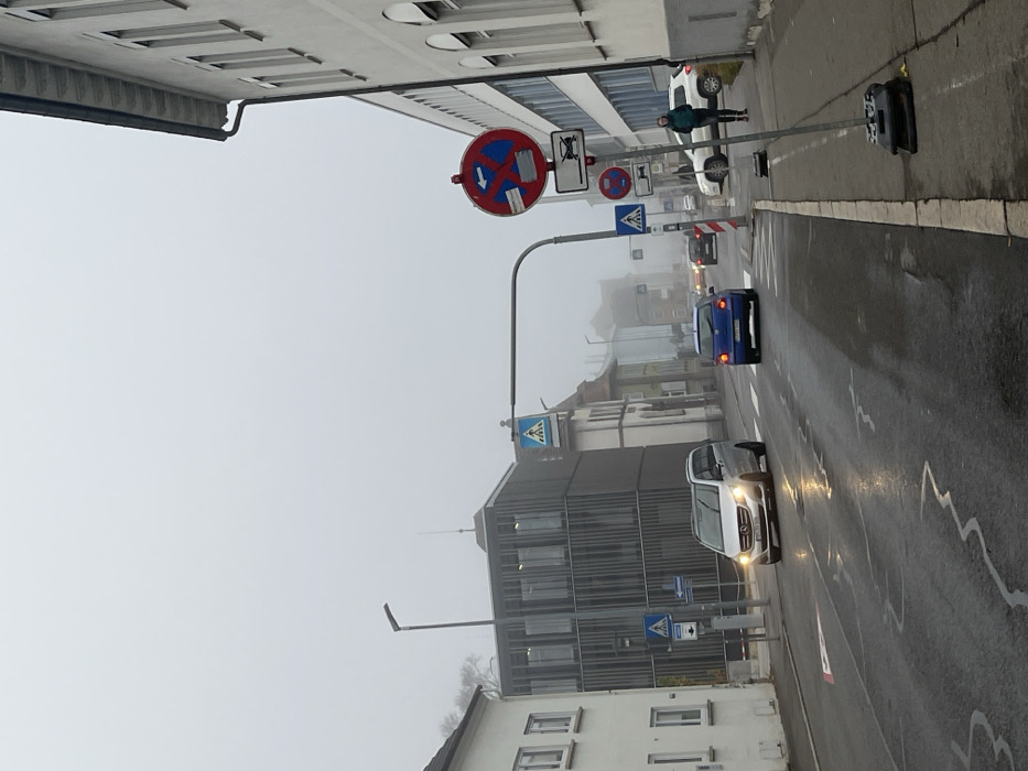 The image depicts a street scene in Tuttlingen, Germany, under foggy and overcast conditions, with wet road surfaces