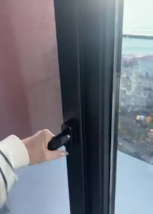 A person in a striped white and black sweater opens a glass door to reveal a balcony view. The door has a black handle and frame. The balcony has a glass railing. Beyond the railing is a view of buildings and the ocean. The sky is a clear blue with a hint of pink at the horizon. The ocean has gentle waves.