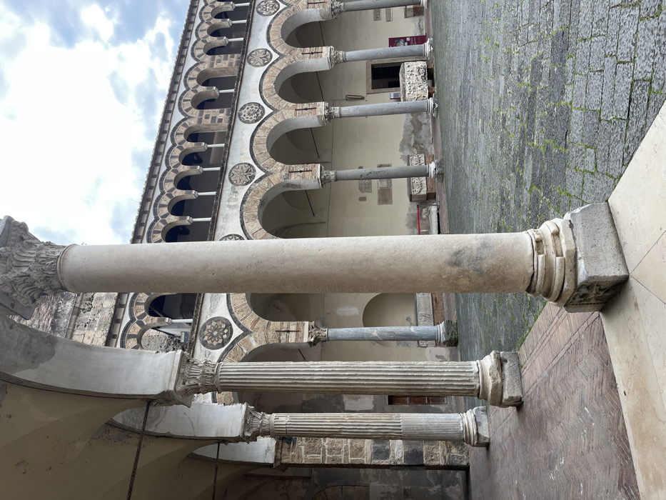 The image depicts the Chiostro del Paradiso (Cloister of Paradise) within the Duomo di Salerno (Salerno Cathedral) in Salerno, Italy