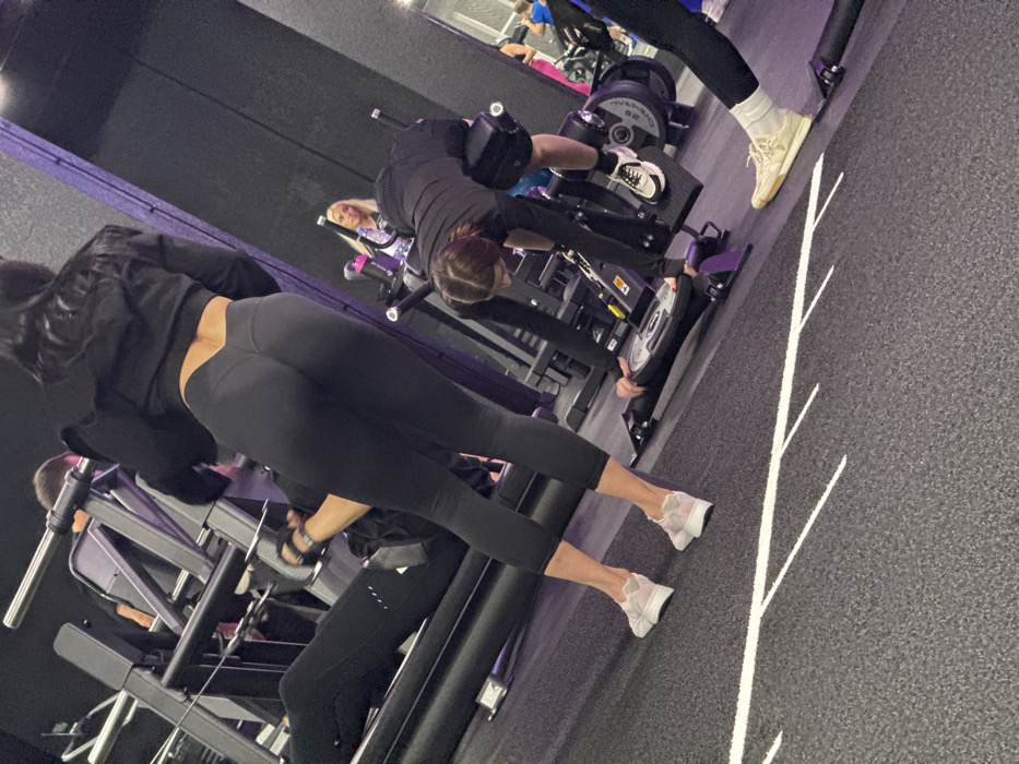 The image displays an interior scene of a fitness center located in Anapa, Russia. The floor is dark gray with white angular markings, and the walls are dark. Artificial lighting illuminates the space. In the foreground, a woman is observed from behind, standing with her back to the viewer. She is wearing black athletic leggings featuring a distinctive V-shaped rear waistband and a black long-sleeved cropped top. Her footwear consists of light pink athletic shoes. To the left, an individual is positioned on a leg press machine, facing away from the camera, actively engaged in the exercise. This person is dressed in black athletic attire, with their torso and legs visible. To the right, another individual is partially visible, seen from behind and the side, bent over a piece of gym equipment. This person appears to be adjusting or loading a circular, dark gray weight plate onto the machine. They are wearing a dark long-sleeved top, dark bottoms, and white and black athletic shoes. In the background, a reflection in a mirror reveals a blonde-haired woman holding a pink water bottle, looking towards the right side of the frame. Additional gym equipment and indistinct figures are visible further in the background. The gym equipment prominently features dark colors with purple accents.