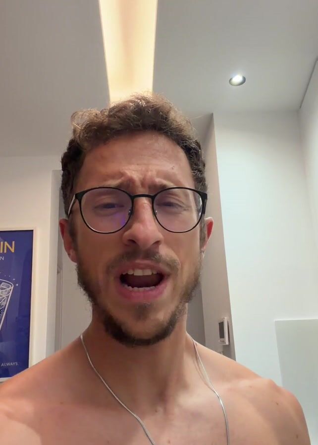 The video starts with a close-up shot of a shirtless man wearing glasses and a silver necklace