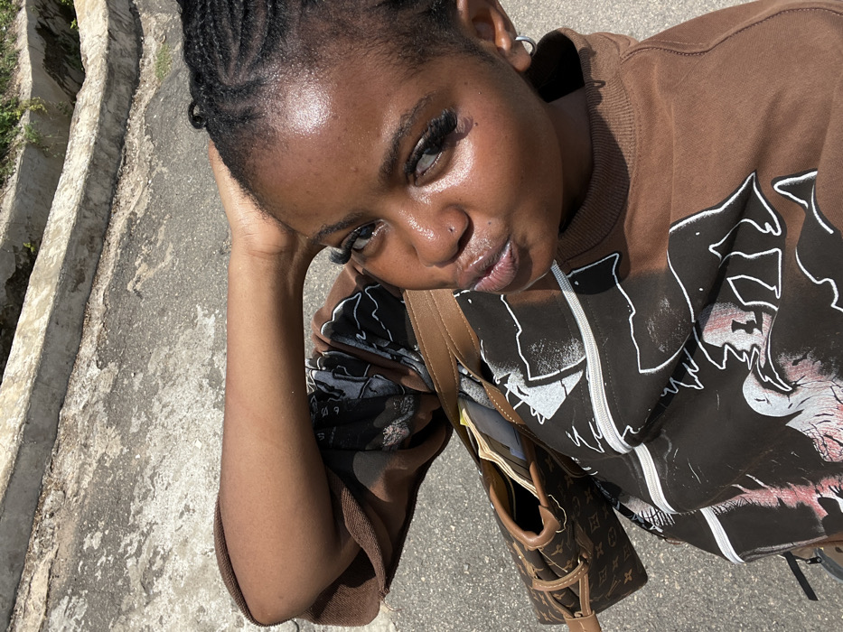 A young Black female is depicted in an outdoor selfie, cropped from the chest up and angled slightly from above. She has dark skin, braided hair, a small stud piercing in her left nostril, and a silver hoop earring in her left ear. Her lips are lightly pursed, directed towards the viewer. Her right hand is raised, with fingers touching the side of her head. She wears a brown, long-sleeved zippered sweatshirt featuring a graphic pattern of white and lighter-toned distressed elements. A brown and tan monogrammed shoulder bag with light-colored papers visible inside rests on her left side. The background consists of a mottled grey paved surface, above which multiple tiered concrete structures or steps are visible, interspersed with minimal green vegetation. The lighting is bright and sunny. The specific location within Ipetumodu, Nigeria, cannot be determined from the visual evidence.