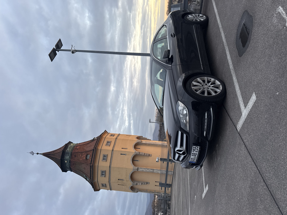 The scene depicts a black, two-door Mercedes-Benz C-Class Coupe (W204 generation) parked on an asphalt surface marked with white parking lines. The vehicle displays a German license plate, "BAD AB 255," on its front. The setting is identified as a parking area, likely a rooftop or elevated deck, in Rastatt, Germany, given the prominent landmark. To the left and rear of the vehicle stands the Rastatt Wasserturm (Water Tower), a multi-level, light yellow-ochre colored structure with a distinctive red-tiled, multi-tiered conical roof topped by a spire and weather vane. The tower features multiple small windows and arched architectural details on its lower levels. On the right side of the frame, a tall, grey metal pole rises, equipped with two rectangular LED lighting fixtures at its apex. Below these lights, a white, spherical security camera is mounted, facing towards the parking area. The sky overhead is largely overcast with shades of grey clouds, though a subtle golden hue is visible on the horizon towards the far right, suggesting either sunrise or sunset. In the distant background, beyond a metal railing or barrier, a panorama of low-lying hills or mountains is discernible, accompanied by sparsely treed terrain. No individuals are present within the frame. A small, dark wet patch is visible on the asphalt to the right of the parked vehicle.
