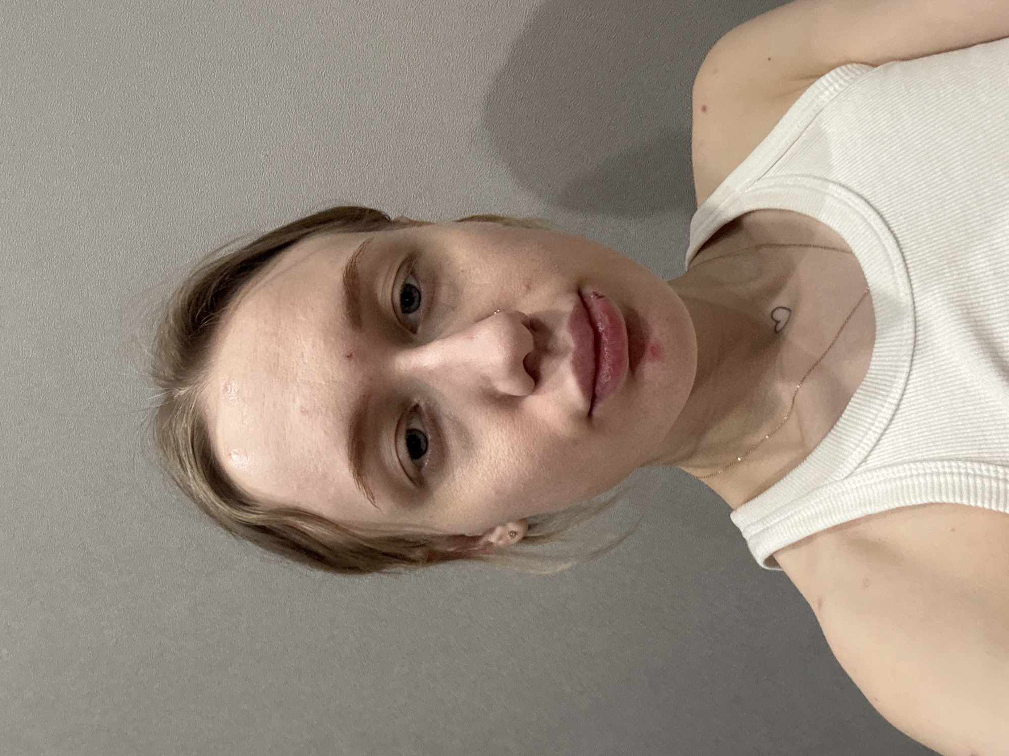 A young woman is shown in a portrait, shot from a low angle, against a plain gray wall. She is wearing a white tank top. She has light skin, light blonde hair, and appears to have some blemishes or imperfections on her face. She also has a nose ring and a small heart-shaped tattoo on her chest. No location is discernible from the image.