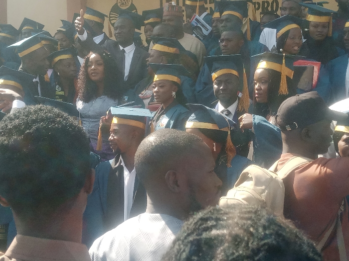 The image depicts a dense gathering of approximately 30-40 individuals, primarily young adults, in the city of Gwafan, Nigeria. The scene is illuminated by bright daylight, suggesting an outdoor or semi-outdoor location, possibly adjacent to a light-colored building facade. A significant number of individuals are attired in academic regalia, specifically dark blue or black graduation gowns and mortarboard caps with yellow bands and tassels. In the upper midground, a man wearing a black suit, white shirt, tie, and a graduation cap gestures with his right thumb raised. To his left, a woman with long, dark, curly hair, dressed in a grey top, looks slightly to her left. Multiple other individuals in academic dress are visible, some looking forward, others glancing in various directions. In the foreground, partially obscuring the main group, the backs of two individuals' heads are visible; one wears a brown shirt, and another wears a black baseball cap and a tan backpack. In the background, a banner or sign with a dark field and yellow text, partially visible as "PRO," along with a crest resembling a national emblem, is discernible. The overall impression is that of a crowded graduation or convocation ceremony.