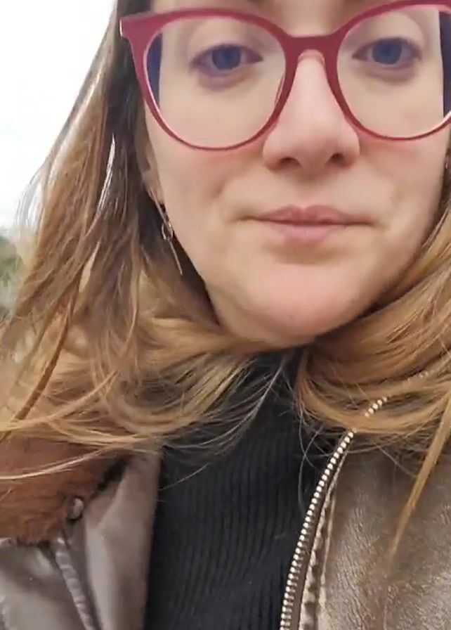 A fair-skinned woman with light brown hair and red-rimmed glasses films herself at eye-level outdoors in daylight