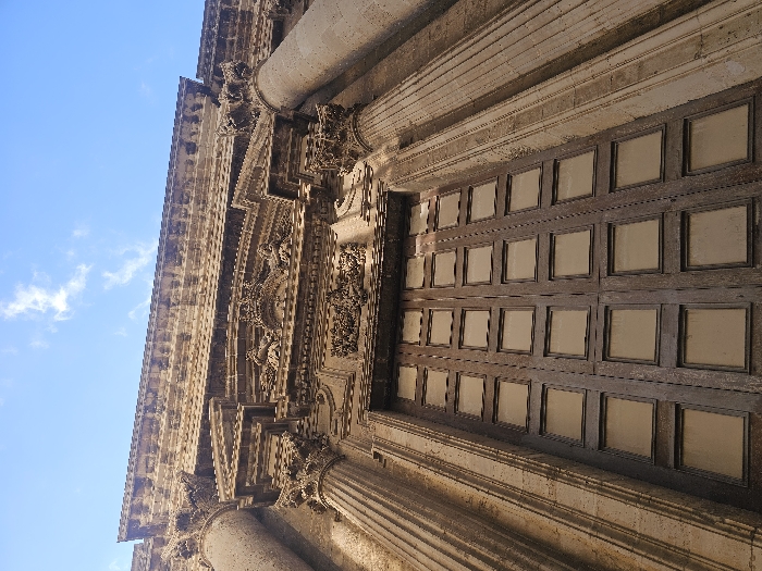 - "The scene displays a low-angle, upward-looking view of the ornate Baroque stone facade of the Duomo di Siracusa (Cathedral of Syracuse), located on Ortigia island in Syracuse, Italy" by FM-Gmgpz2, licensed under CC BY 4.0