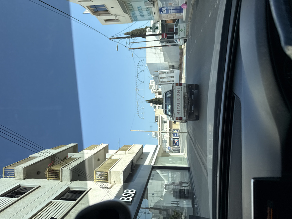 The image depicts a daytime street scene in Paralimni, Cyprus, captured from the interior perspective of a vehicle