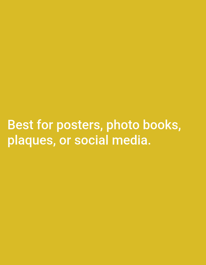 The image features a yellow background with white text centered at the bottom. The text reads "Best for posters, photo books, plaques, or social media." The phrase suggests that the image is suitable for various applications, including visual communication and physical displays.