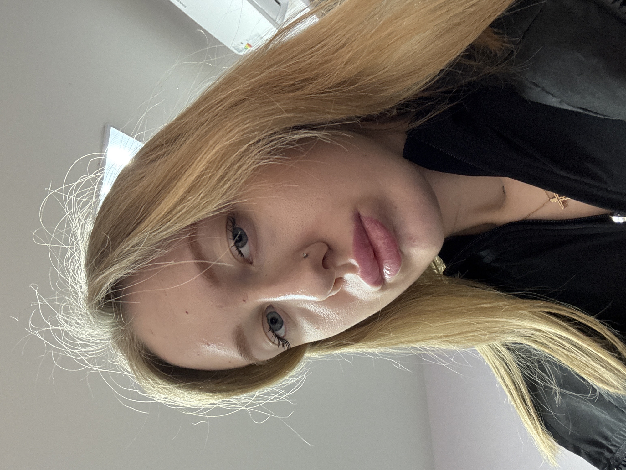 A close-up, slightly angled shot presents a young woman with blonde hair, blue eyes, and full lips. She has a nose piercing and is wearing a black top. A gold necklace with a cross pendant is visible at her neckline. The background is a plain white or light grey. There is no information about the location in the city of Ovoshchnoy, Russia in this image.