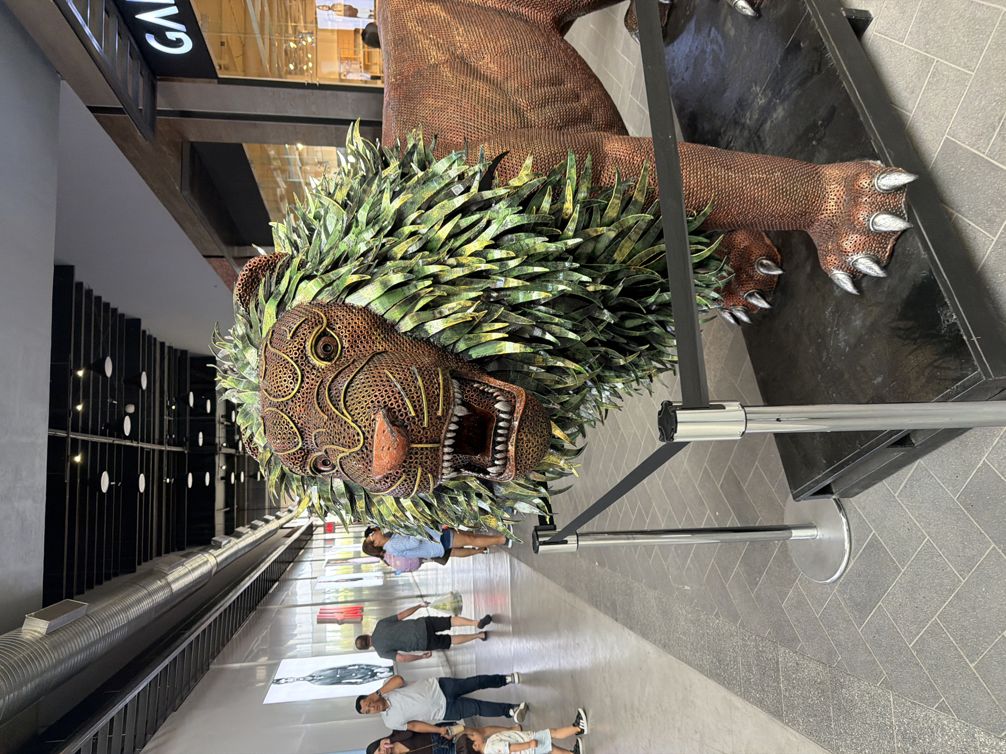 n indoor shopping mall in San Pedro Cholula, Mexico, featuring a large metal sculpture of a lion. The sculpture is positioned on a black base and has a textured body with a green and yellow mane. The lion is roaring with visible teeth and sharp claws on its front paws. Several people are walking past the sculpture; one is wearing a blue shirt, shorts and backpack, one is wearing a grey shirt and black shorts, and others are wearing casual clothing. The mall's interior includes a modern design with black structural elements, bright lighting, and storefronts visible in the background. A metal railing is placed around the lion sculpture.