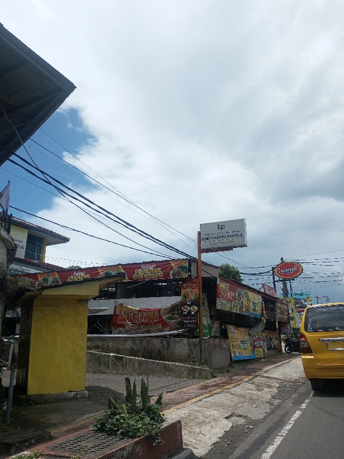 A street scene features a yellow van on the right, partially obscuring a parked motorcycle. Buildings are adorned with various food advertisements and banners, under a cloudy sky. Overhanging power lines crisscross above. A yellow structure with a small garden sits on the left side of the street. A sign on a post reads "BUMI PERDAIVA RAKARJA." The street appears to be slightly worn with patches and minor damage.