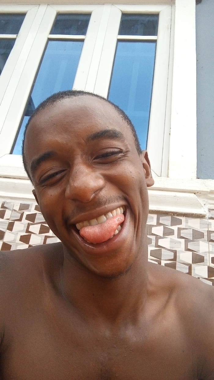 A bare-chested man with dark skin grins broadly, sticking out his tongue. He is positioned in front of a white window with three blue panes and a wall featuring a brown and white geometric pattern. The man's eyes are partially closed, and his expression is playful. The lighting suggests the photo was taken outdoors or in a well-lit space.