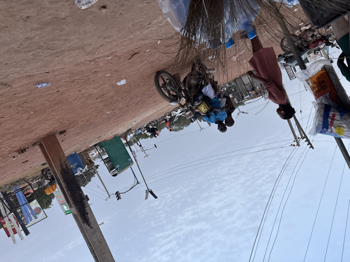 A bustling roadside scene features several individuals, one standing and two on a motorcycle. Power lines traverse the sky, while parked motorcycles and various goods are visible in the background. Litter is scattered on the reddish-brown ground. Street vendors with carts and signage add to the vibrant atmosphere.