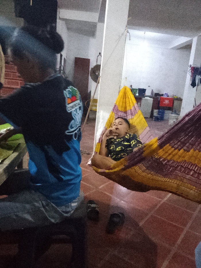 A boy is in a striped hammock, resting with his hand near his mouth. Another person, cropped, sits with their back to the camera, wearing a blue and black shirt. Two pairs of sandals are on the tiled floor between them. Behind the boy in the hammock, a yellow and purple triangular hammock hangs. The background shows a home interior with furniture and decorations.