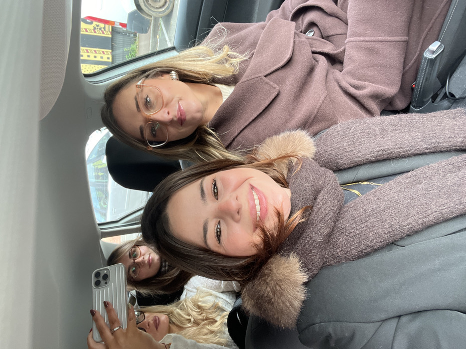The image depicts four adult females inside the cabin of a passenger vehicle, in Roubaix, France