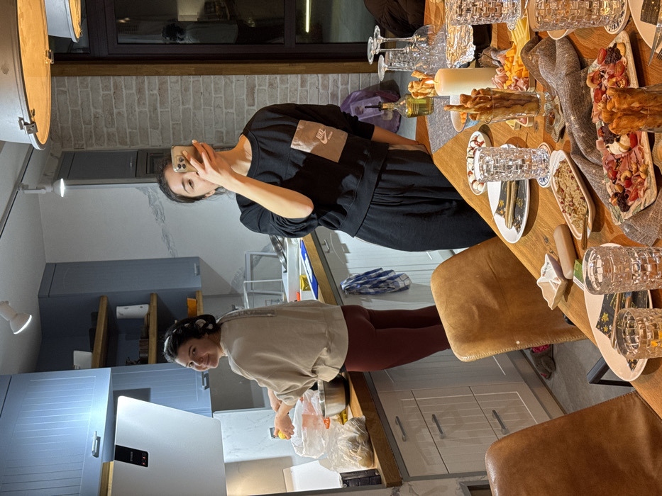 Two women are in a kitchen. One, wearing a black Nike sweatshirt and black pants, appears to be taking a photo with her phone. The other, in a beige sweater and maroon leggings, is preparing food. A wooden dining table is laden with glasses, a white candle, and plates of various appetizers. The kitchen features blue cabinets and a white refrigerator. The scene has warm lighting and suggests a social gathering.