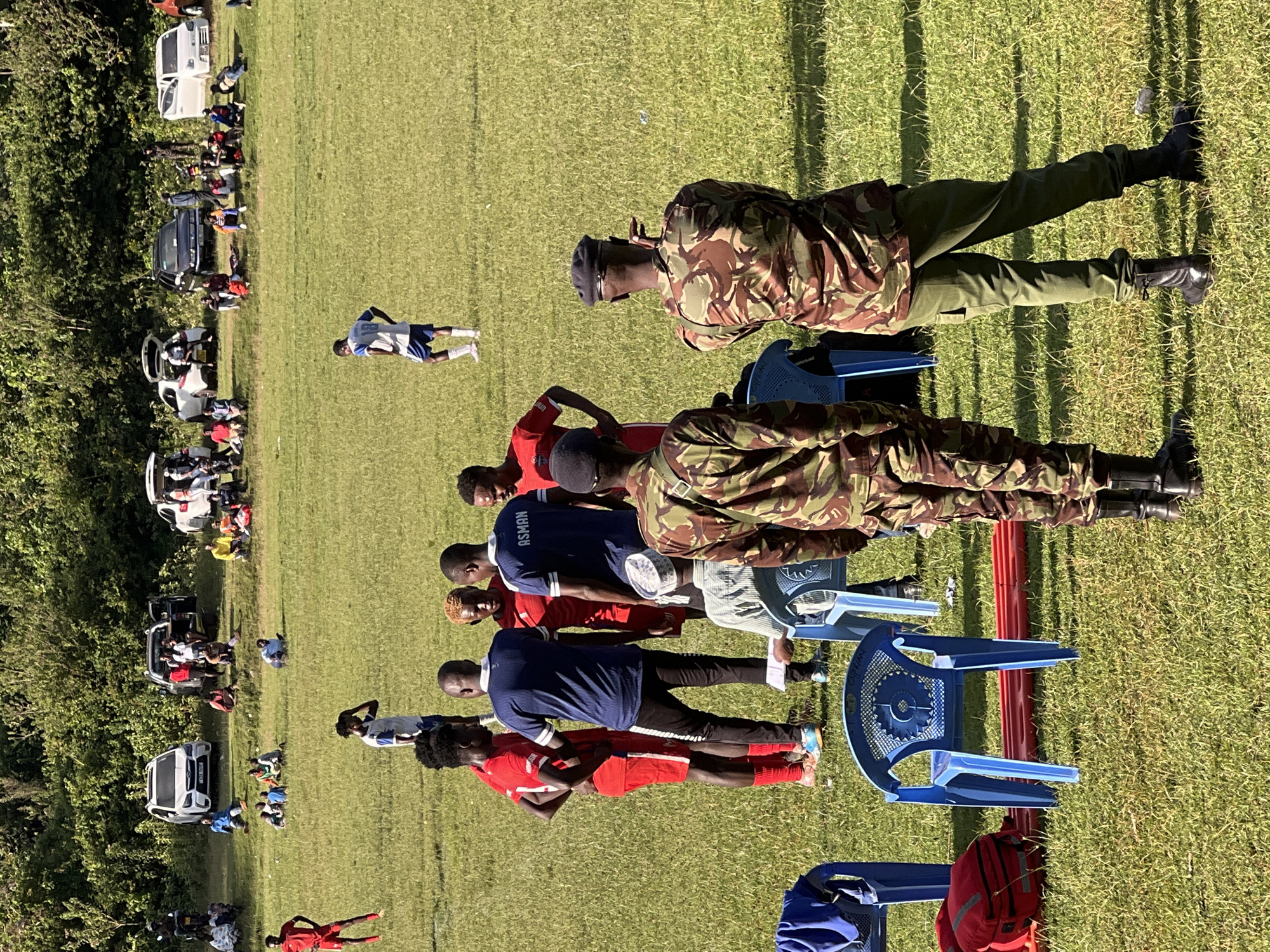 The image depicts a scene on a grassy field in Kahigaini, Kenya. A group of soccer players dressed in red and blue uniforms stand near blue plastic chairs. Two uniformed military personnel stand behind the group. Various vehicles are parked in the background near a line of trees. Several people can be seen milling around the vehicles.