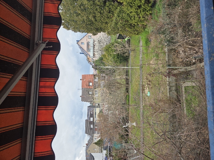 The image displays a view from a balcony or elevated position overlooking a multi-level residential garden area in Ludwigshafen am Rhein, Germany, under an overcast sky. The top of the frame is occupied by the underside of an orange and black striped awning with a scalloped edge. A blue metal railing forms the bottom edge of the immediate foreground. The midground features a segmented garden area. Several deciduous trees are visible, mostly bare or with minimal early foliage, suggesting early spring. Patches of green grass are interspersed with areas of tilled earth or bare ground. A white, multi-tiered garden ornament, possibly a birdbath, stands on the left side of the garden. Various shrubs and low fencing or retaining walls delineate different sections of the garden. A light green tarp or plastic sheet lies on the ground in one section. A thin, white pole extends vertically near the center. Dense, evergreen trees and bushes occupy the right side of the frame. In the background, a cluster of residential buildings with varied architecture is visible, situated on an elevated terrain. Roofs are predominantly brown, red, and grey tiles. Some buildings feature balconies. Utility lines are discernible against the cloudy, grey sky. No individuals or specific actions are observed.