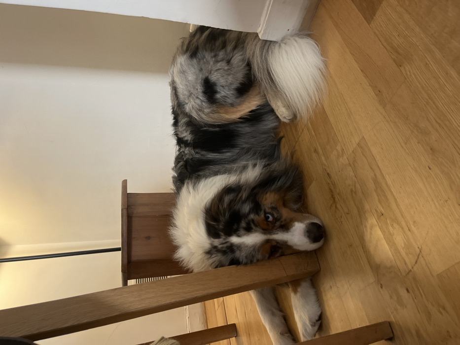 An indoor scene in the city of Unknown, Unknown, features a merle-patterned dog lying on a light-toned wooden floor
