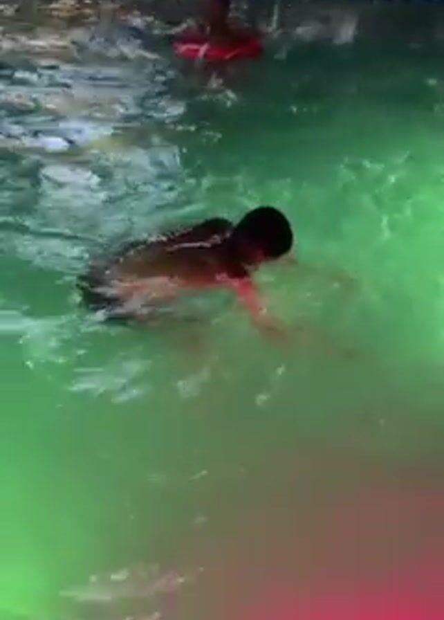 Three young men are in a brightly lit, slightly murky swimming pool. One is wearing a red swim ring. The water is colored green by lights underwater, with some red light also showing. The men are swimming and interacting. The pool is surrounded by a metal railing.