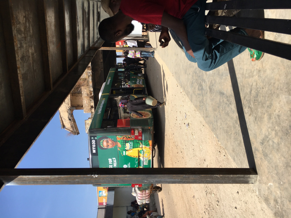 The image depicts an outdoor bus terminal or park in Jos, Nigeria, likely in the vicinity of the former Terminus Market. The scene is illuminated by direct sunlight under a clear blue sky. In the foreground, a partial view of a shelter structure is present, consisting of dark metal pillars and beams supporting a concrete roof. A dark metal bench is positioned under this shelter. Two males are seated on the bench; the closer individual, seen from the waist down and partially from the back, wears a red shirt, dark trousers, and has a beard, holding a mobile phone in his right hand. The midground features a large, green mass transit bus, marked "MT030" on its rear. The bus displays a prominent advertisement for "GRAND" brand, showing a cartoon woman holding a yellow bottle, with text "CHOICE FOR MEALS" and "Fortified with Vitamin A." A small, two-wheeled cart carrying bundled items is attached to the rear-left of the bus. An individual clad in a dark robe and a patterned head covering is seen walking right, away from the bus, carrying a light-colored bucket. Multiple other individuals are standing and moving around the bus on the unpaved, dusty ground. The background reveals a severely dilapidated, multi-story concrete structure with exposed rebar and crumbling sections, indicative of a long-term state of disrepair. Faintly visible commercial signage and additional people are present further in the background.