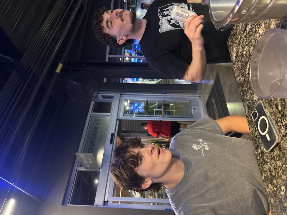 Two young men are seen standing near a high-top table with drinks and a phone. The person in the foreground is wearing a gray "Shelby Cobra" t-shirt, while the other person is wearing a black t-shirt. The background features the entrance to a building, possibly a Topgolf location, as a golf-branded floor mat is visible.
