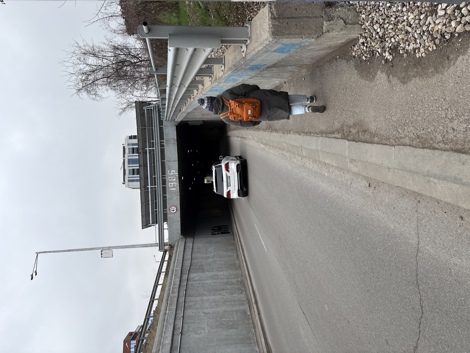 - "A pedestrian wearing a dark coat and an orange backpack walks on a sidewalk alongside a road" by FM-uM38h1, licensed under CC BY 4.0