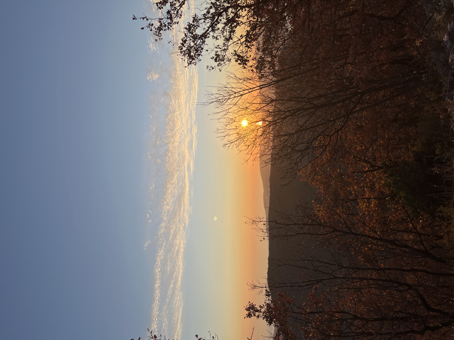 A serene landscape unfolds with the sun casting a warm glow through silhouetted trees. A gradient sky transitions from blue to orange, punctuated by wispy clouds. Distant hills are visible through the trees. The photograph captures a quiet, natural scene at sunset.