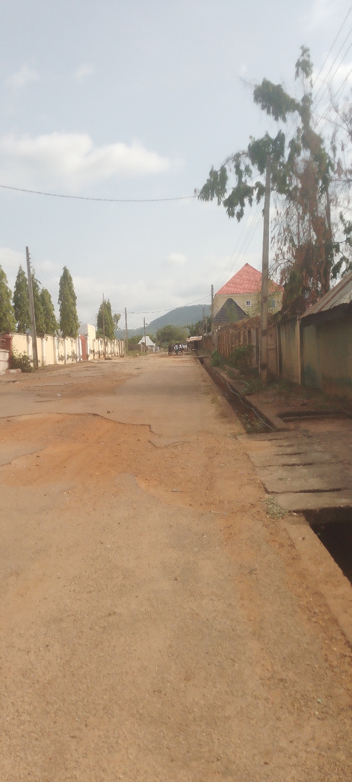 The image captures a street scene in Unknown, Unknown, looking down a dirt and gravel road under a partially cloudy, light blue sky. In the distant background, green, tree-covered mountains are visible along the horizon. The foreground and midground are dominated by an unpaved road, exhibiting exposed reddish-brown soil and uneven surfaces consistent with wear and erosion. Along the left side of the road, a continuous stretch of pale, possibly cream-colored, perimeter walls encloses properties. Behind these walls, several tall, slender evergreen trees are planted at intervals. Utility poles with overhead power lines are positioned along this left margin. On the right side of the road, an open concrete drainage ditch runs parallel to the thoroughfare. Sections of this ditch in the mid-foreground are covered with rectangular concrete slabs. Beyond the ditch, a large, two-story building with light yellow walls and a distinctive reddish-orange, multi-pitched roof is prominent further down the road. Closer to the right foreground, a tree with sparse green leaves and a dark trunk partially obscures the view. More utility poles and power lines are visible here. In the midground, approximately three to five individuals are observed on the dirt road, appearing to be walking or standing. Their specific attire or detailed actions are not discernible due to distance and image resolution. No vehicles are present within the frame.