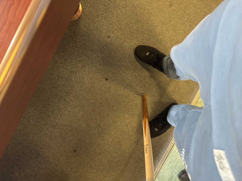 The scene depicts an interior view from a first-person perspective, looking down at an individual's lower body and the surrounding floor, located in Stara Zagora, Bulgaria. The individual is wearing light blue sweatpants, with a white label visible on the upper left leg. Black athletic shoes, identified by a metallic "AF1" lace tag on the visible right shoe, are worn. A wooden pool cue, labeled "Ontario" on its light-colored shaft and featuring a darker brown tip section, is positioned horizontally in front of the individual, extending across the lower-center of the frame. The floor is covered with a dark green or olive-brown carpet, showing several small, dark stains. In the upper right corner, a section of a reddish-brown wooden structure with a polished, reflective golden-bronze trim is visible, consistent with the rail of a billiard table. A rounded, golden-bronze support element is visible beneath this wooden structure. A light blue-green surface is partially visible in the lower-left quadrant, beneath the left leg, suggestive of another surface or floor covering nearby. The overall environment is an indoor recreational setting, likely a billiard hall or game room.