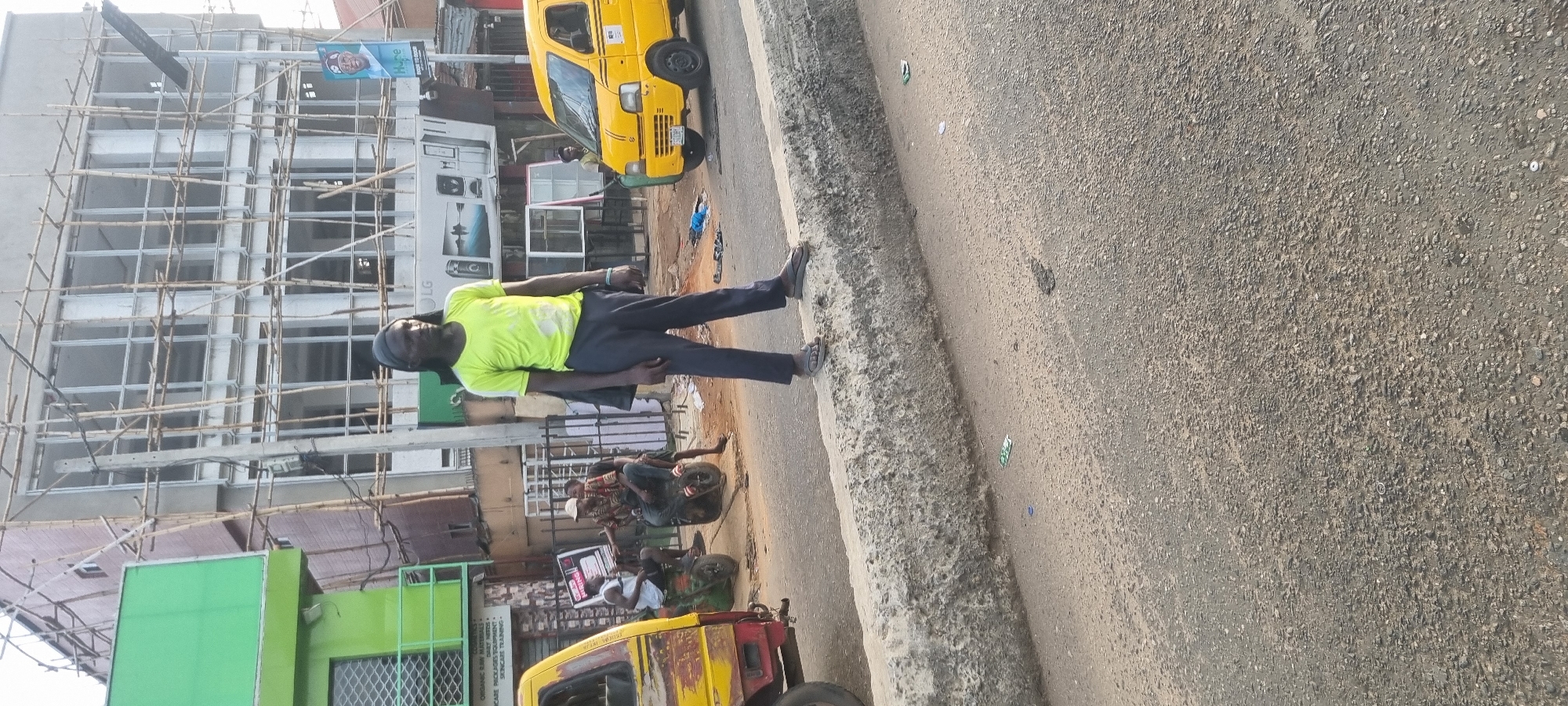 The image depicts a street scene in Ikeja, Nigeria. A man wearing a bright green shirt and dark pants stands on the edge of a road. Behind him are several yellow motorized tricycles (Keke Napeps). Some men are sitting on one of the tricycles. A building under construction with bamboo scaffolding is in the background. Another building is painted green. The road is asphalt and appears worn.