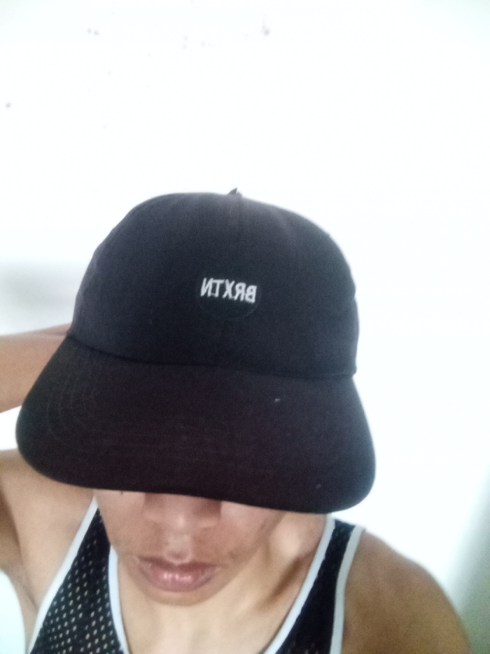 A person is wearing a black cap with white "BRIXTON" text embroidered on the front