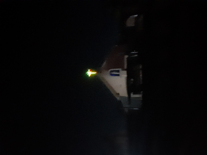 In a dimly lit setting, a Lego spaceship model is visible. A green and yellow light emanates from the front of the model, giving it a radiant glow. The rest of the spaceship and surrounding environment are shrouded in darkness, making the illuminated portion the focal point of the image. Some computer hardware is visible beside the Lego model.