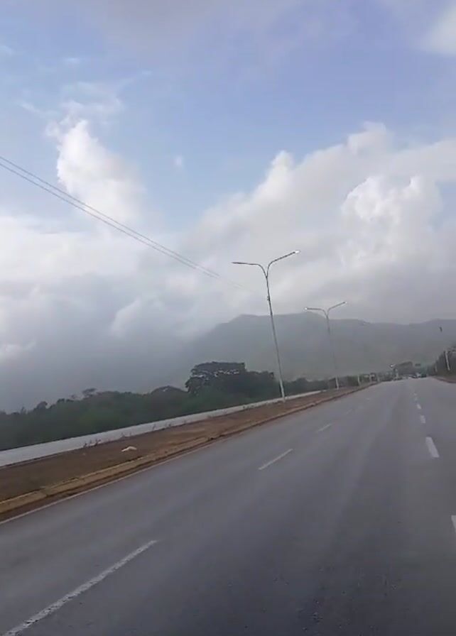view from a vehicle moving down a wet asphalt road. Streetlights line the road and a yellow curb separates the road from greenery on one side. A mountain is visible in the distance, partially obscured by clouds. The sky is cloudy with patches of blue. There's a single wire strung along the streetlights on the left. There is minimal traffic.