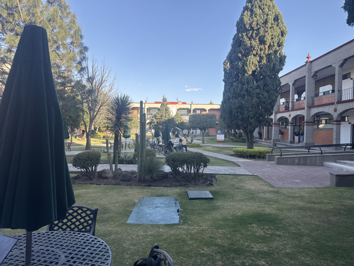 The image displays an outdoor courtyard or campus area in San Andrés Cholula, Mexico, under clear, bright blue skies with direct sunlight. In the foreground, a large, dark green folded patio umbrella occupies the left side, with portions of a black metal lattice-patterned table and two matching chairs visible beneath it. The midground consists of a large, well-maintained grass lawn with paved pathways winding through it. Landscaped beds are present within the lawn, featuring various desert flora, including columnar cacti, smaller globular cacti, yucca plants, and low shrubs, interspersed with rocks. Multiple trees of varying heights and species are visible, including tall, slender evergreen trees and deciduous trees with bare branches. In the mid-background, a cluster of approximately 5-7 individuals are seated at outdoor tables equipped with umbrellas, engaged in conversation or relaxation. Other individuals are observed walking on the pathways or standing near the buildings. The right side and background of the scene are dominated by multi-story institutional buildings characterized by a distinctive architectural style. These structures feature arched walkways, supporting columns, balconies with dark railings, and reddish-brown accent walls, possibly brick or stucco. Another similar building is visible further in the background. Shadows are pronounced, consistent with bright daylight. Two light-colored, square panels are embedded flush with the grass in the mid-foreground lawn area.