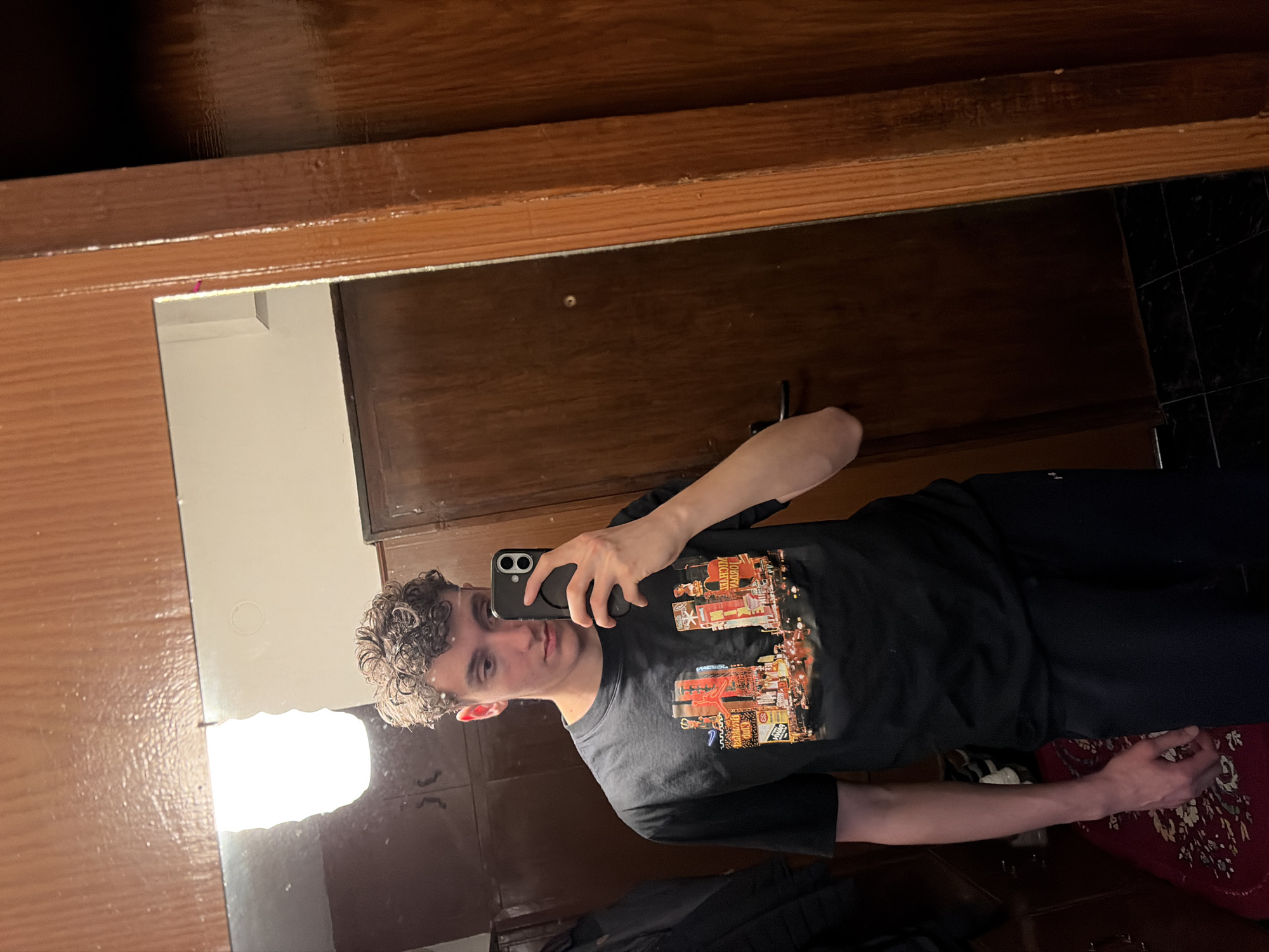 A young man with curly hair is taking a mirror selfie. He is wearing a black T-shirt with a colorful graphic design. He holds a black smartphone in his left hand, partially covering his face. The mirror reflects a room with wood paneling and a dark floor. The room appears to be dimly lit. The location in Vidin, Bulgaria is not discernible from the image.