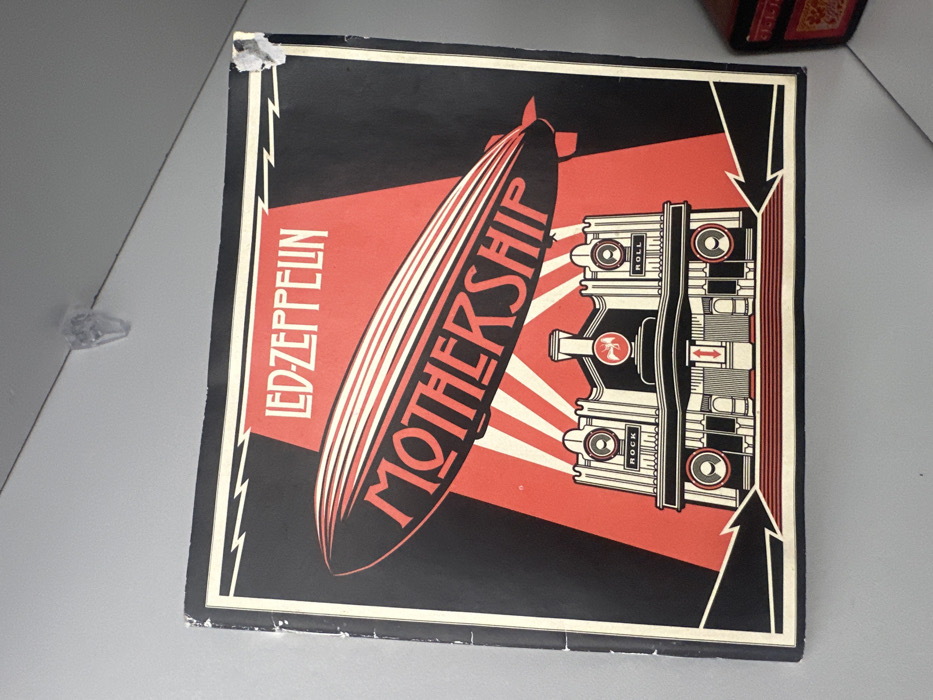 square album cover for Led Zeppelin's "Mothership" compilation. The cover art features a red and black design with a stylized zeppelin and a building. "LED ZEPPELIN" is written vertically on the left, and "MOTHERSHIP" diagonally across the zeppelin. The building includes details with "ROCK" and "ROLL" inscribed on each side of it. A white border surrounds the image with lightning bolt patterns in each corner. The cover appears slightly worn.