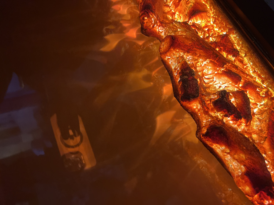 An abstract, warm-toned image featuring an illuminated, textured rock-like structure on the right. The "rock" emits a bright, orange light, casting reflections and shadows on the left side. The left side exhibits a murky, orange-brown background with indistinct shapes and patterns. A blurred rectangular object with a partial logo is faintly visible in the lower left corner. The image has a dynamic interplay of light and shadow, creating a mysterious atmosphere.