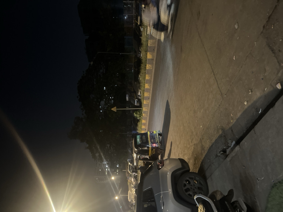 The image depicts an urban street scene at night in Mumbai, India. The primary light source is a bright street lamp positioned on the far left, casting significant glare and illuminating the immediate foreground. In the left foreground, the rear section of a silver Jeep Compass SUV is parked on the roadside. To its right, a dark blue and yellow auto-rickshaw is positioned on the road, partially obscuring a person near its driver's side door, suggesting ingress or egress. Further down the road, on the right, a motorcycle or scooter is captured in motion, exhibiting motion blur as it travels away from the camera. The road surface is paved and appears dry. A concrete curb, painted with alternating yellow and grey blocks, delineates the road from a grassy verge on the right. Beyond this verge, a parking area contains numerous dark-colored vehicles. In the background, dark foliage from trees and silhouettes of multi-story buildings are discernible. A yellow triangular sign with an indistinct symbol or arrow is visible on a pole near the road's center. Further down the street on the left, additional vehicles, including a white van, are visible under less intense street lighting. A concrete gutter runs along the immediate foreground's edge.