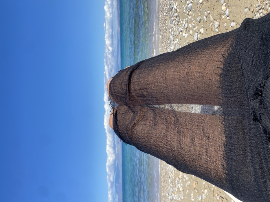 The image presents a first-person, downward-angle perspective from a beach in Skala, Greece. The foreground features the legs of an individual, partially covered by a sheer, crinkled black fabric, likely a sarong, which displays frayed edges around the knees. Tanned skin is visible through the translucent material. A light-colored garment is discernible between the legs beneath the sheer fabric. The immediate environment consists of a sandy beach sparsely covered with small, light-colored pebbles. Beyond the beach, the sea transitions from turquoise at the shoreline to deeper blue further out, with a faint wave line. In the distant background, a low-lying landmass or mountain range is visible on the horizon, partially obscured by a band of elongated white clouds. The sky above is a vivid, clear blue with a few scattered white clouds. The scene is illuminated by direct sunlight.