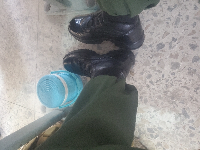 A partial view of an indoor scene depicts an individual's lower legs and feet on a speckled light gray terrazzo floor. The individual is wearing olive green uniform trousers and polished black lace-up boots. To the left of the boots rests a light blue cylindrical container with a white band and a light blue handle, its lid adorned with concentric circular ridges. Portions of light-colored furniture legs are visible on both the left and right edges of the frame. The location is an unspecified indoor setting within the city of Unknown, Unknown.