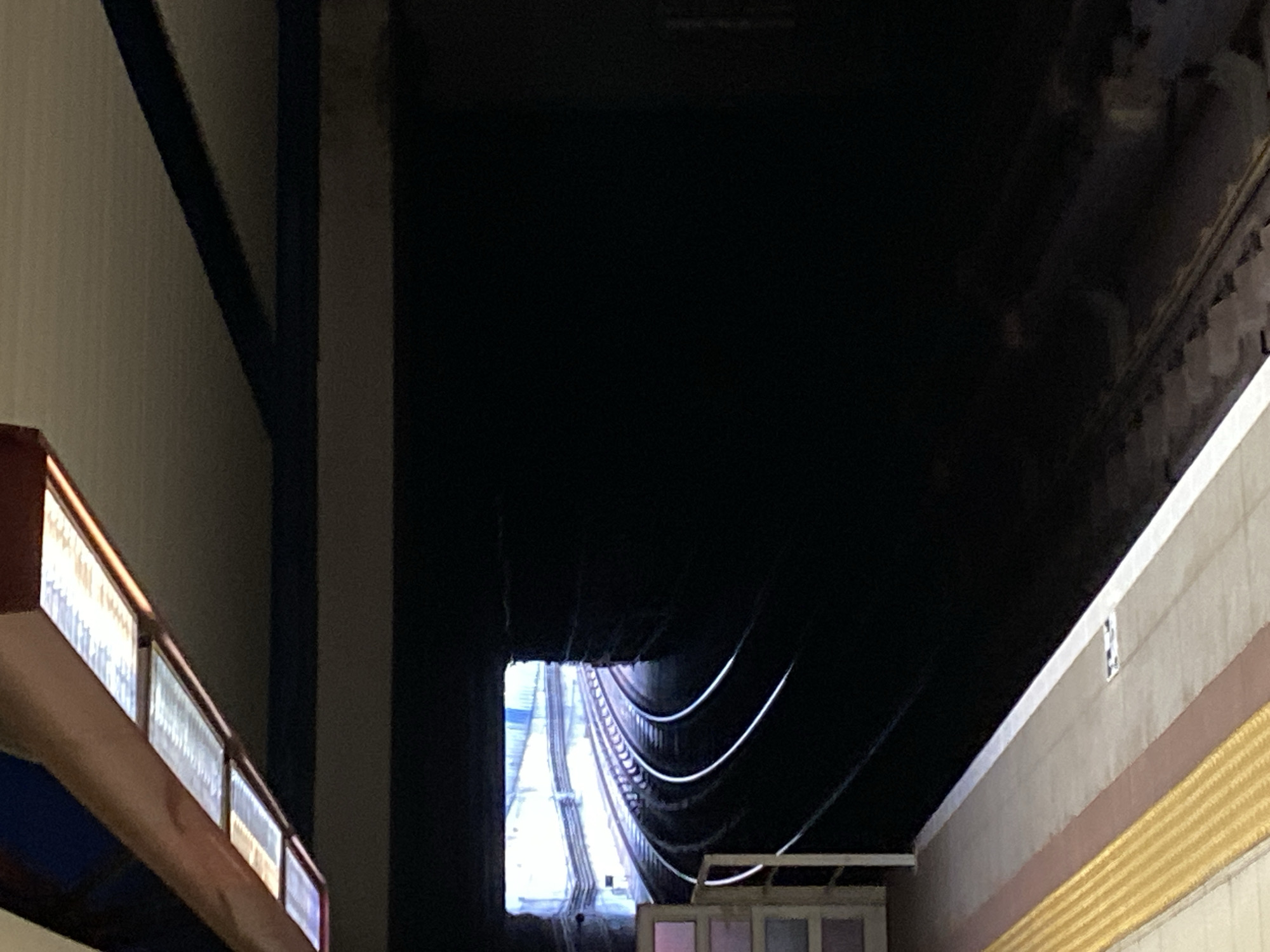 A low-angle, indoor shot depicts a subway tunnel, possibly a segment of the Sofia Metro in Sofia, Bulgaria. The tunnel is predominantly dark, obscuring details within, except for the illuminated tracks and support structures visible through the tunnel's exit point. White, curved elements suggest infrastructure for power or communication lines running along the tunnel ceiling. Parts of a station platform are seen on either side of the tunnel entrance, with architectural details like lighting fixtures and decorative wall trim. The absence of people and trains indicate the subway system may be inactive, or that the photograph was taken in a restricted area.