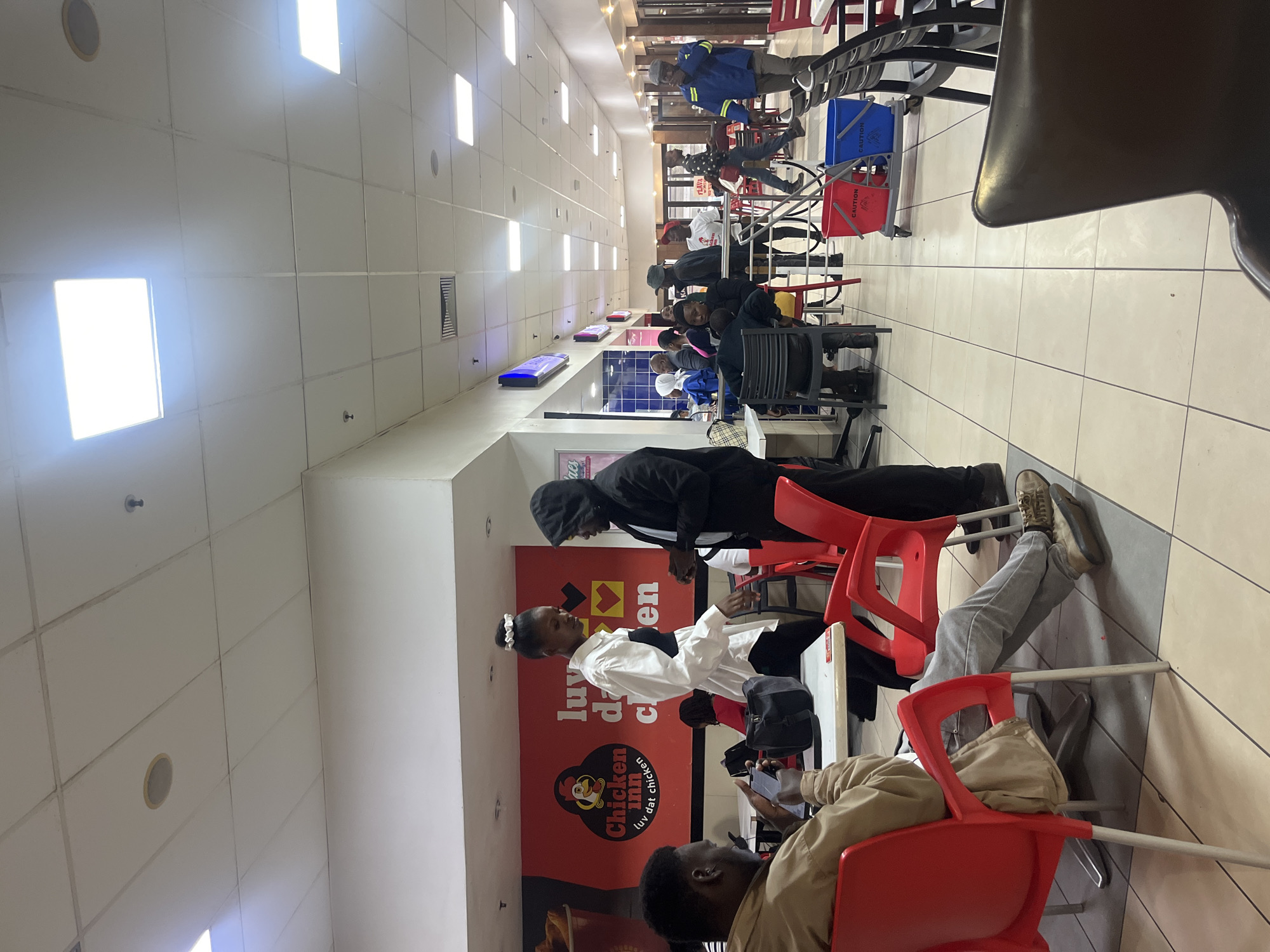This image depicts an indoor food court located within a shopping mall in Harare, Zimbabwe. The environment features a light-colored tiled floor with dark grout lines, and a white drop ceiling equipped with recessed square LED light panels and circular speakers. A long corridor extends into the background, lined with various food vendor stalls. In the foreground to the left, a dark-skinned male, wearing a tan jacket and grey trousers, sits in a red plastic chair, actively engaged with a smartphone held in both hands. A black bag rests on the white table in front of him. Behind this table, a prominent red wall banner displays the "Chicken Inn luv dat chicken" logo and branding. Standing near this table are a dark-skinned female, dressed in a white oversized shirt with a black corset-style top and dark trousers, and a dark-skinned male, wearing a black hooded jacket with the hood up. They are positioned facing each other, appearing to engage in conversation. In the midground, a red and a blue mop bucket on a wheeled grey cart are visible, both labeled "CAUTION." Numerous dark-colored chairs and tables are arranged throughout the space. Several individuals are seated at tables, while others walk along the corridor. On the left, multiple food stalls with illuminated blue signage are present. In the background, a dark-skinned male in a blue long-sleeved shirt with yellow reflective strips is seen walking to the right, carrying a blue bucket. Another individual is visible with a bicycle parked against the right wall further down the corridor. People of various ages and attire populate the entire scene, walking and sitting.