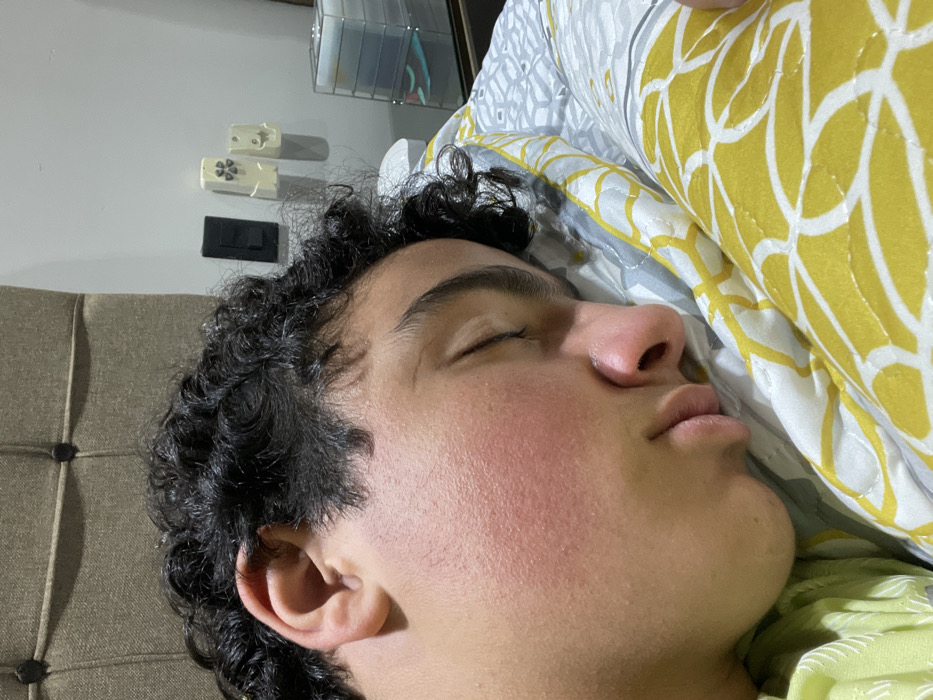 The image displays an individual, likely male, asleep on their right side in a bed. The person has dark, curly hair and closed eyelids. A pronounced area of redness is visible on the left cheek. The individual wears a light green garment on their upper torso. They are positioned on a pillow and covered by a comforter, both featuring a pattern of yellow organic shapes and grey geometric designs on a white background. In the background, a light brown upholstered headboard with two dark button accents is visible against a plain white wall. Mounted on the wall are a black electrical switch plate and two beige electrical outlets/switches, one of which incorporates a four-bladed fan or clover symbol. Adjacent to the bed, a clear, multi-compartment acrylic organizer containing colored items and a white electronic device are present on a surface. The specific location within Acatlipa, Mexico, cannot be determined from the visual information provided.