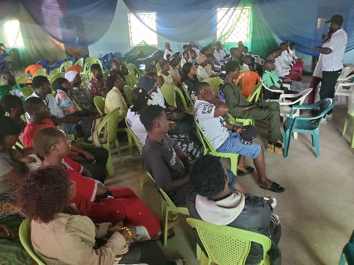 The image depicts an indoor gathering in a hall located in Barikin Gidar Kanat, Nigeria. Approximately 50-70 individuals, predominantly young adults, are present. A male speaker, dressed in a white collared shirt and dark trousers, stands on the right side of the frame, facing and addressing the seated audience. His right arm is raised in a gesturing motion, and he holds a small, dark object in his left hand. The audience, comprising both males and females in diverse casual attire including t-shirts, shirts, dresses, trousers, and some head coverings, occupies rows of plastic chairs, primarily green, with some blue, white, and orange chairs interspersed. Most audience members are seated and appear attentive, directing their gaze towards the speaker. The hall features light-colored walls, a ceiling decorated with draped blue and light blue fabric, and two rectangular windows on the far wall covered by green grilles. The floor is light-colored. The scene portrays a presentation or lecture event.