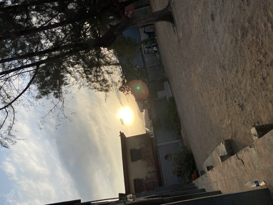 An outdoor scene in Agege, Nigeria, depicts a setting sun illuminating a large, unpaved dirt yard. The sun, a bright yellow disc, is positioned centrally-left on the horizon, casting an orange hue across a sky with scattered white clouds. In the immediate foreground, to the left, a building's dark wall and several concrete steps are visible. A clear plastic water bottle with a blue label rests on the ground beside the bottom step. The expansive midground is an open, reddish-brown dirt area. Several tall trees with thin trunks and sparse, dark foliage are scattered across the right side of this area, their leaves silhouetted against the sky. A distinct green and orange lens flare is present in the lower right quadrant of the image, originating from the sun. In the background, a low concrete fence stretches horizontally. Behind this fence, on the left, stands a two-story building with a light-colored, weathered facade and dark window openings; a small bird is perched on its roofline. Further to the right, behind the fence, are additional structures and dense green foliage. A group of approximately three to five indistinct human figures are visible near the fence on the right, appearing to be standing or gathered. Their actions and identities are obscured by distance and shadows.