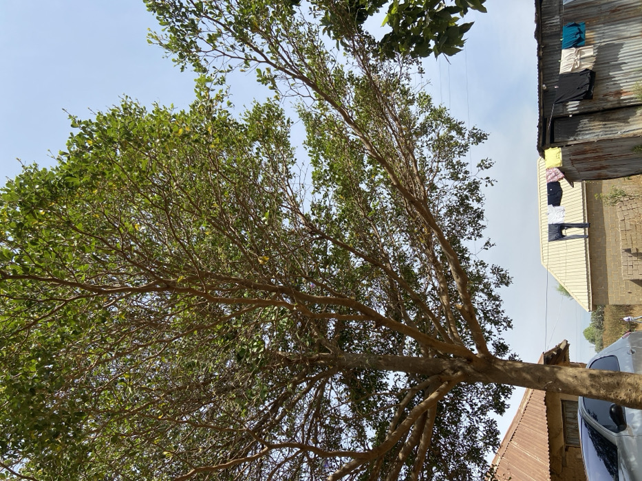 This image depicts an outdoor scene in Jos, Nigeria, during daylight hours under a clear, light blue sky with some atmospheric haze. A large deciduous tree with dense green foliage and numerous brown branches dominates the foreground and extends into the midground. In the left foreground, the front-left portion of a light-colored (possibly silver) vehicle, likely a hatchback, is partially visible behind the tree's trunk. Further left and slightly behind the tree, a building with a rust-colored corrugated metal roof is partially obscured. In the midground to the right of the tree, a building with a light-colored, possibly tan or off-white, corrugated metal roof is visible. Several items of clothing, including dark trousers, a white shirt, a dark shirt, and a light yellow shirt, are draped across this roof, indicating they are drying. Adjacent to this building and further right, a smaller structure constructed from weathered corrugated galvanized iron sheets is present. Hanging on or over this structure are additional clothing items: a black top, a white top, a blue top, and another light-colored top. In the distant background, a single individual wearing light-colored clothing is observed walking on what appears to be a dirt path or open ground. The ground in the visible areas consists primarily of dry earth, with some sparse, low-lying vegetation.