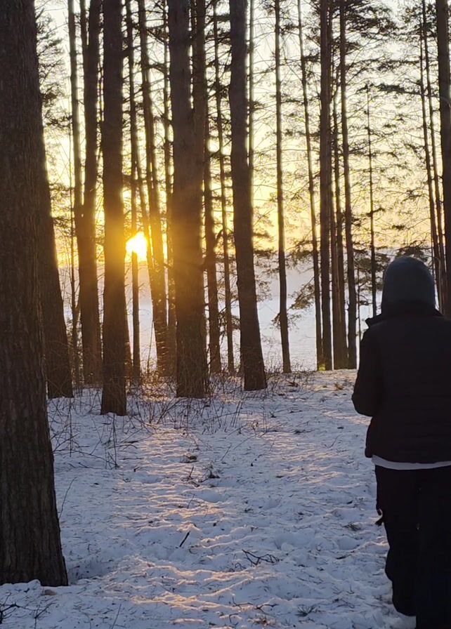 A person is walking towards the sun through a snowy forest. The person is wearing a dark jacket, a light-colored hooded sweatshirt, and dark pants. The sun is low on the horizon and shining through the trees. The forest floor is covered in snow. The person is walking on a path in the snow. The trees are tall and thin.
