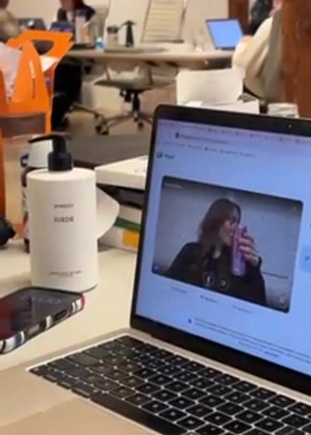 The scene depicts an office environment with a laptop taking center stage. On the laptop screen, a Google Meet video call shows a woman taking a sip from a pink can. To the left of the laptop is a bottle of Byredo Suede lotion and a mobile phone displaying 15:00. In the background, other individuals are working at their desks, using laptops. The lighting appears to be natural, and the overall setting suggests a typical workday in a modern office.